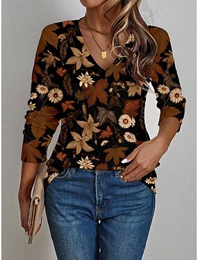 Dame T skjorte Trykt mønster Blomstret Grafisk Årgang Stilfull Klassisk Langermet V-hals Vanlige topper Daglig Brun Vår Høst