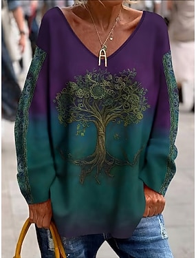 Dame T skjorte Trykt mønster Blomstret Grafisk Planter Elegant Mote Stilfull Langermet V-hals Vanlige topper Daglig Helg Hvit Gul Lilla Vår Høst