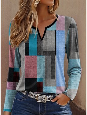 Dame T skjorte Trykt mønster Grafisk Geometrisk Årgang Stilfull Fritid Langermet Hals med hakk Vanlige topper Daglig Helg Blå Gul Lilla Grønn Vår Høst Vinter