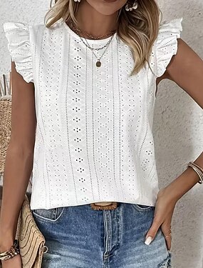 Dame T-skjorter med øyeombroderi Drapering Utskjæring Slipserygg Helfarge Elegant Årgang Stilfull Kortermet Kappeerme Crew-hals Vanlige topper Daglig Ut på byen Hvit Rosa Vin Lyseblå Sommer Vår