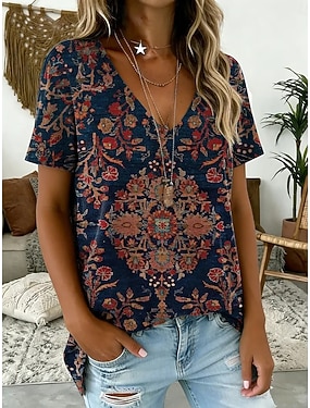 Dame T skjorte Trykt mønster Blomstret Grafisk Planter Årgang Stilfull Fritid Kortermet V-hals Lange topper Avslappet Daglig Helg Blå Svart Rød Sommer Vår