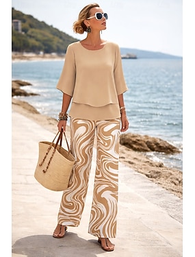 Dame Singleter Buksesett Bred Bukseben Bukser Ermeløs Crew-hals Printer Trykt mønster Mote Ferie Helg Blå Svart Beige Sommer Normal