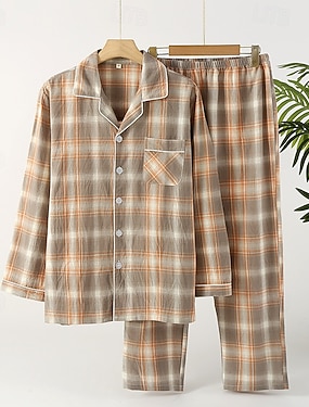 Herre lounge Nattøy Pyjamas Sett Pyjamas topp og bukse 2 deler Ruter Stilfull Fritid Komfort Hjem Daglig Seng Bomullsblanding Komfort Myk Knaphul Langermet Skjorte Bukse Snorer Elastisk midje Vår Høst