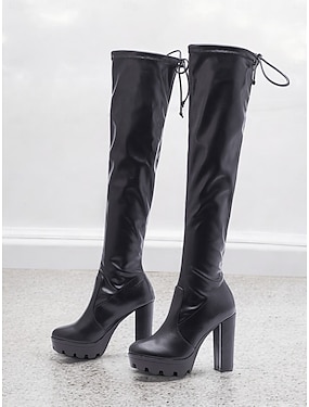 plattformstøvler over kneet for kvinner med tykke høye hæler og snøring, sexy lårhøy stil for klubbklær og fester