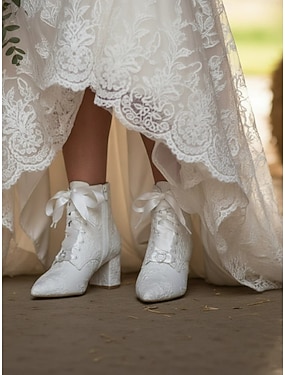 Dame bryllup sko Støvler Valentines gaver Hælstøvler Rustikk bryllup Ankelstøvler Brudesko Brudepike sko Blonder Tykk hæl Spisstå Romantikk Blonder Sateng Snøring Svart Hvit Krystall