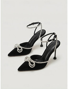 svarte stiletthæler med spiss tå og sløyfe i rhinsten til dame - elegante pumps med krystallankelrem til cocktailfest &kveldsgalla