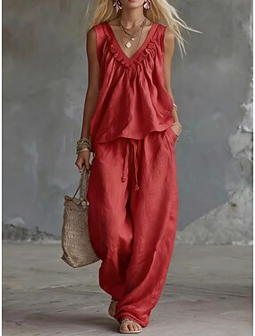 Dame Linsett i bomull Todelt sett Buksesett Ermeløs V-hals Helfarge Mote Gatemote Avslappet Daglig utendørs Svart Gul Rosa Sommer Normal