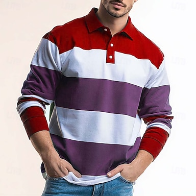 Herre Horisontale strips Rugby Polo Langermet Poloskjorter Skjorter med krage Sportsklær Fritid utendørs Skole treningsklær 3D-utskrift Vår Høst Blå Rød Brun