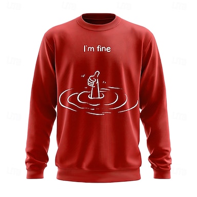 Herre Rød Crew Neck Genser med Morsom Drukning Tommel Opp 'Jeg Har Det Bra' Grafikk