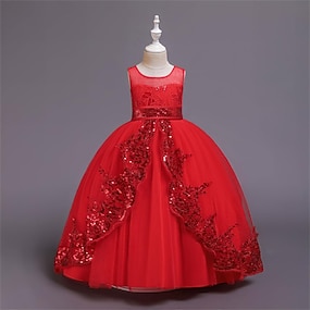 Blomsterpikekjole Jente Formell kjole Bryllupsantrekk Fest Bryllup Formell Mote Bedårende Formelt Lapper Netting Helfarge Ermeløs Crew-hals Rosa Rød 4 år +