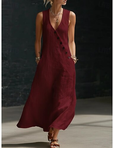 Dame Maxikjole Imitert bomullslin Skiftkjole Fritid Daglig Løstsittende عادي Kortermet V-hals Blå Rød Lilla Brun Sommer Vår Høst