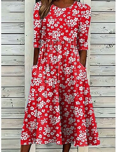 Dame Midikjole Skiftkjole Ferie Fritid Bohem Normal Blomstret Grafisk Halvlange ermer Crew-hals Rød Grønn Beige Sommer Vår