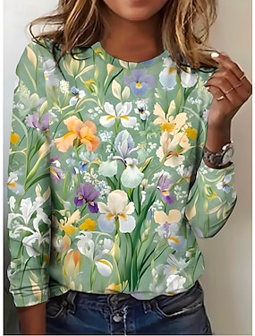 Dame T-skjorte Langermet Crew Neck Langermet Tunika Blomster Elegant Vintage Vanlig Tops Daglig Utgang Helgetrykk Gressgrønn Hvit Lys Grønn Prefall