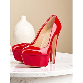 Røde stiletthæler i lakkskinn til dame, skinnende høye hæler i ankelreim med metallnålehæl til julefester &høytidsfeiringer