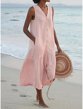 Dame Midikjole Kjoler i bomullslin Skiftkjole Solkjole Tankkjole Mote Moderne Daglig utendørs Ferie Løstsittende عادي Ermeløs V-hals Blå Rosa Beige Grå Sommer Vår