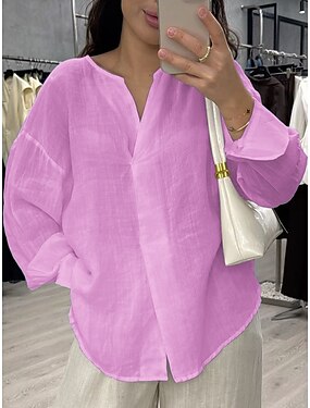 Dame Bluse Bomullsskjorte Imitert bomullslin Helfarge Daglig Stilfull Grunnleggende Langermet V-hals Vanlige topper Daglig Blå Rosa Brun Beige Vår Høst