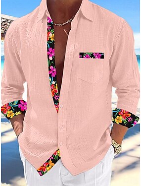 Herre Skjorte Linskjorte Uformell skjorte Bomullsskjorte عادي Feriereise Hawaiisk Svart Hvit Rosa Blå Langermet Aftæpning Vår & Vinter Klær Knapp ned