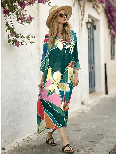 Kvinne Maxi Kjole Lin Som Pustende Lettvekts Solkjole A-Linje Kjole Ferie Uformell Boho Strand Løs Passform Blomstret Grafikk 3/4 Lengde Erme V-Hals Rosa Orange Brun Grønn Sommer Vår