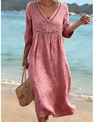 Dame Midikjole Kjole med A-linje Fritid utendørs Strand Ut på byen Løstsittende Helfarge 3/4 ermer V-hals Blå Svart Gul Rosa Sommer Vår