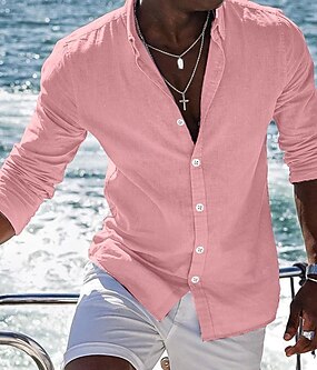 Herre Skjorte linskjorte Skjorte med bandkrage Sommerskjorte Strand Klær Skjorte med knapper عادي Feriereise Curise Svart Hvit Rosa Blå Langermet Båndkrage Vår sommer Klær