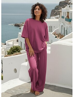 Dame lounge Sett Grunnleggende Ren farge Lomme Elastisk midje T skjorte Bukse Daglig Gate Langermet Crew-hals Blå Svart Hvit Navyblå Lysebrun Sommer Vår
