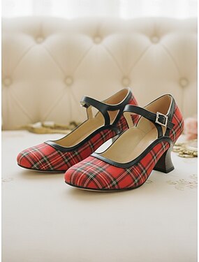 Røde rutete Mary Jane-pumps til dame med svart kant – vintage rund tå fra 1950-tallet med blokkhæl til retrofester og daglig bruk på kontoret. &stilige damer