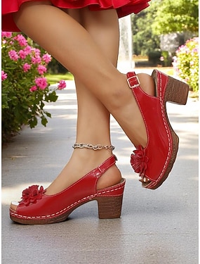 Røde slingback-sandaler i lakkskinn med blomsterdetaljer til dame – retro sko med blokkhæl til hagefester og sommerdates