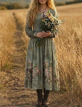 Dame Midikjole Imitert bomullslin Boho-kjole Uformell kjole Floral kjole Mote Moderne utendørs Feriereise Ut på byen Normal Blomstret Langermet Crew-hals Blå Navyblå Oransje Sommer Vår