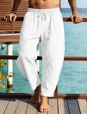 Herre Linbukser Bukser Sommerbukser Strandbukser Elastisk midje Sideknapp Plisseringer عادي Komfort Pustende Full lengde Avslappet Daglig Ferie Ferie Mote Svart Hvit