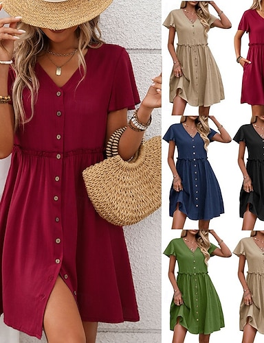 Dame Mini kjole Kjole med A-linje Sommerkjole Fritid Daglig Normal عادي Kortermet V-hals Svart Vin Navyblå Grønn Sommer Vår