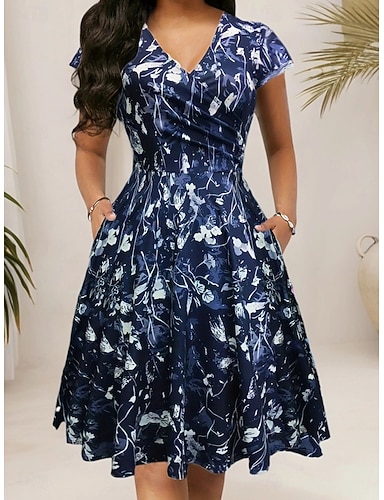 Dame Midikjole Solkjole Kjole med A-linje Fritid Fest Ferie Normal Blomstret Grafisk Kortermet V-hals Blå Hvit Rød Grønn Sommer Vår