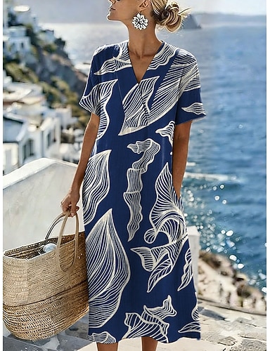 Dame Midikjole Solkjole Uformell kjole Ferie Fritid Strandstil Strand Fest Løstsittende Grafisk Blad Geometrisk Kortermet V-hals Blå Grønn Sommer Vår