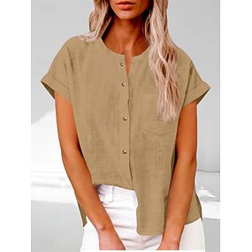 Dame Skjorte Bluse Imitert bomullslin Knapper عادي Fritid Kortermet Crew-hals Lange topper Daglig Ferie Ut på byen Blå Svart Hvit Lilla Kakifarget Sommer Vår