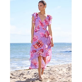 Dame Solkjole Floral kjole Sommerkjole Knelang kjole Lilla Ermeløs Blomster botanikk Mote Blomster Drapering Blomster stil Printer Vår sommer Krysstropper foran Rynker mønster kjole Strandferie