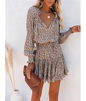kvinners floral leopard rynket volang v-hals mini kjole daglig ferie langermet sommer vår