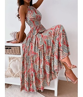 Dame Maxikjole Uformell kjole Boho elegante kjoler Boho-kjole Bohem søt stil Stilfull Feriereise Daglig Strand Løstsittende Grafisk Ermeløs Grimehals Rød Blå Sommer Vår Høst