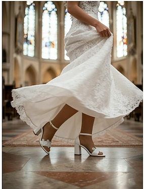 hvit sateng blokkhæl brudesandaler med floral ankelstropp – perfekt for bryllup og mottakelser