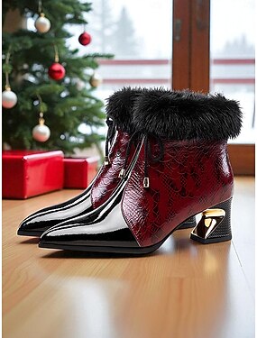 damestøvletter i ekte skinn med minkpelskant, patenterte, spisse blokkhæler med skjøter, luksuriøs vinterfest &kveldssko