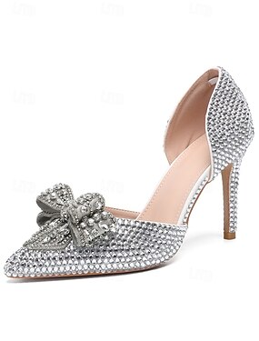 Damesko med sølvkrystallpynt og sløyfe – elegante stiletto-brulesko til kirkebryllup og formelle arrangementer