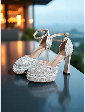 Damesko med glitter og høy hæl, plattformsko med høy hæl, elegante sko til bryllupsgjester til hagebryllup &utendørs feiringer