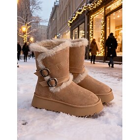 Brune vinterstøvler med fuskepelsfôr til dame – spennedetaljer, koselig varme og platåsåle for avslappet utendørsbruk, snødager og vintermote