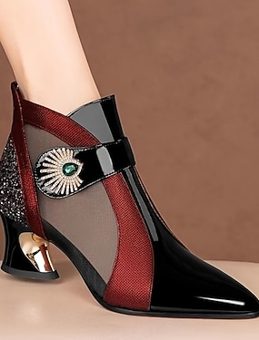 svarte og røde ankelstøvletter for kvinner med meshpaneler og pyntede hæler - elegant motesko for spesielle anledninger