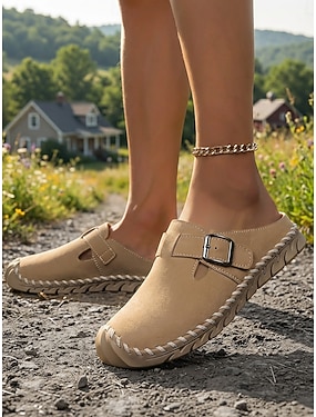 håndsydde tresko i khakifarget materiale for kvinner – justerbare spennesko med lukket tå for turgåing, hagearbeid, reiser og hverdagsbruk.