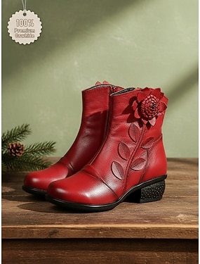 Røde ankelstøvletter i skinn med blomsterapplikasjon til dame – korte vintagestøvletter med mellomhøy hæl for både hverdagslige og pene antrekk