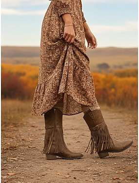 Brune damestøvletter med frynser i kunstskinn, nagledetaljer og lave blokkhæler, bohemsk western-cowboy-stil