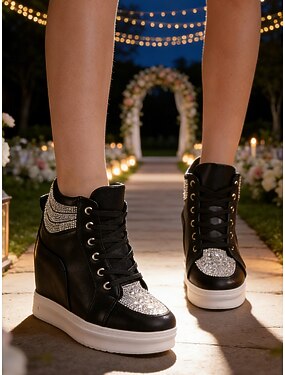 Damesko med elfenbenshvite platåsko til brudekjoler, glitrende kilehælsko til utendørs hageseremoni
