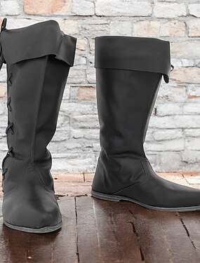 svarte, sammenleggbare knehøye støvletter for menn i gotisk renessansestil med snørerygg, ideelle for kostymefester og gjenskapninger fra middelalderen