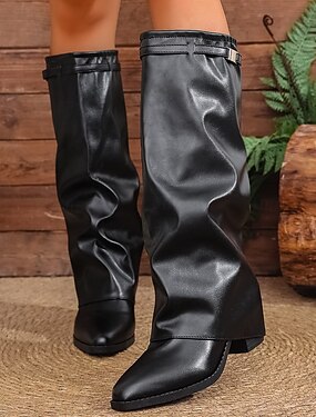 Svarte knehøye støvletter i imitert skinn til dame – stilige støvletter med blokkhæl og justerbare spennedetaljer, trendy og allsidig fottøy