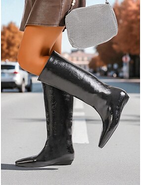 Brune knehøye støvletter i kunstskinn til dame – blanke, flate støvletter i modisk stil for høstens streetwear og hverdagsbruk