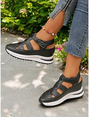 Svarte, chunky platåsandaler til dame – komfortable reisesko med høy blokkhæl for sommerferier i byen, feriesteder og byvandringer